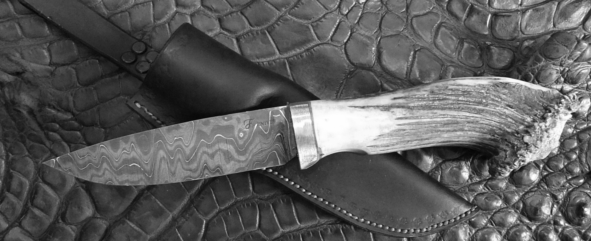 - Rukojeť - Stabilizovaná karelská bříza, wengé, mamutí stolička, fíbr. Napuštěno tungovým a pomerančovým olejem. Záštita z mosazi.